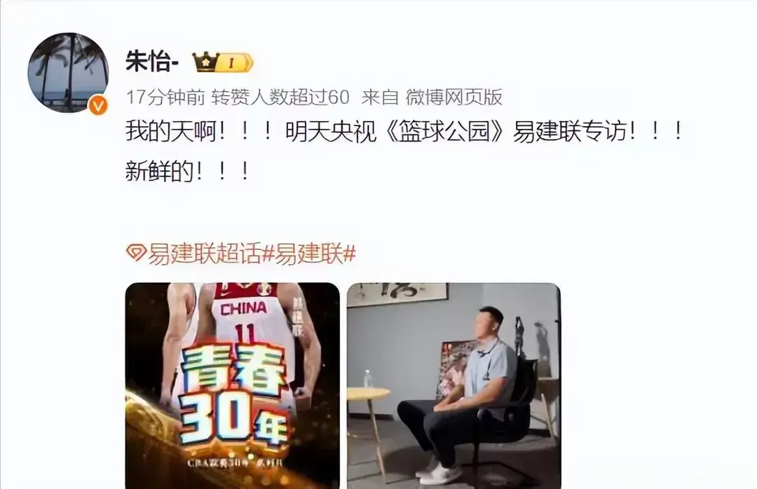 根据宣传预告,6月20日的时候,央视《篮球公园》节目会播放易建联为主要人物的CBA联赛30年系列片子。